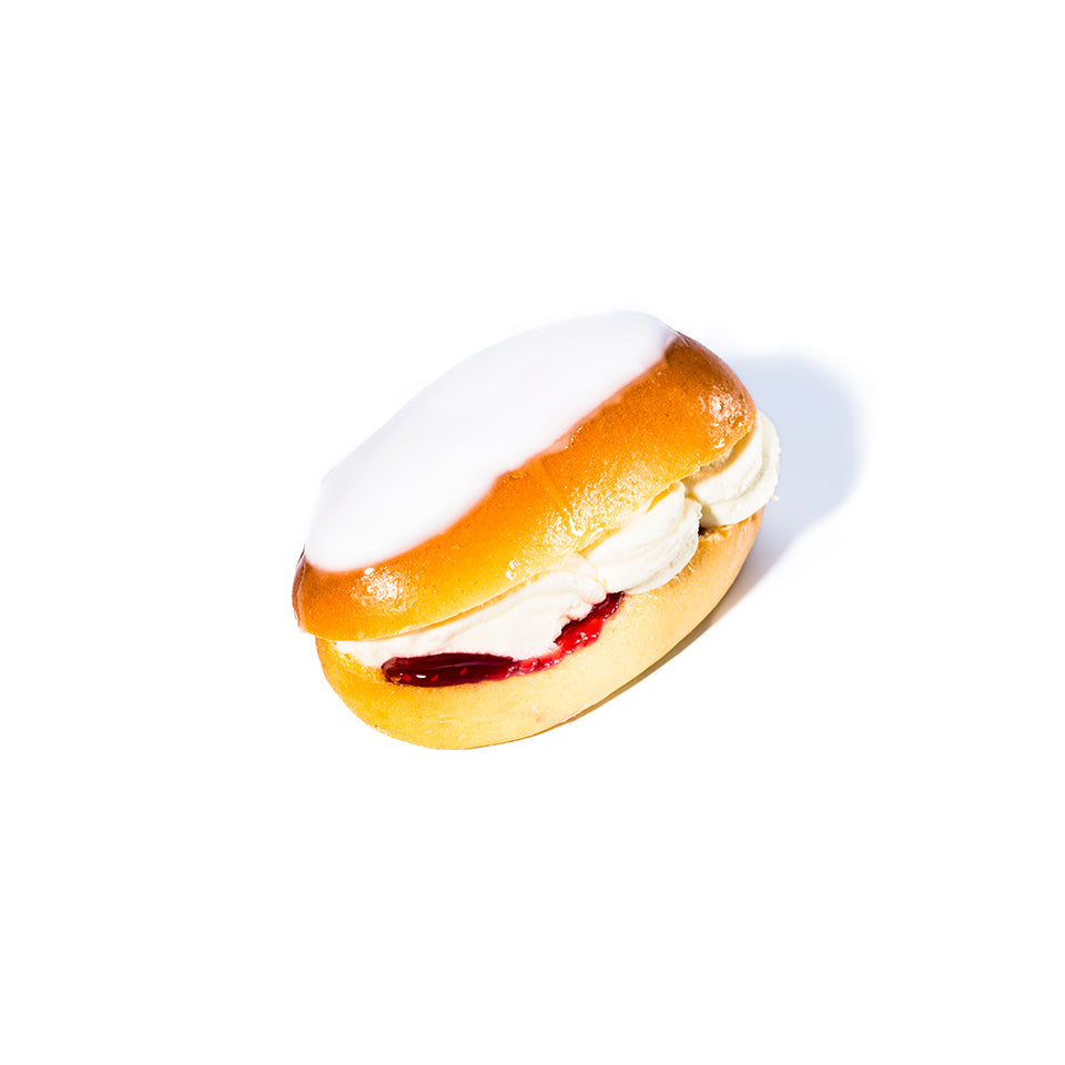A golden sweet bun filled with freshly whipped local cream and raspberry jam and topped with sweet, soft icing.